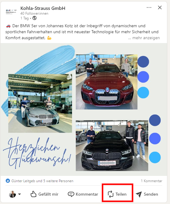 Beiträge können auf LinkedIn mit oder ohne Kommentar geteilt werden. Man muss nur sicherstellen, dass man den gewünschten Beitrag auf dem Unternehmensprofil teilt - und nicht auf dem privaten Profil.