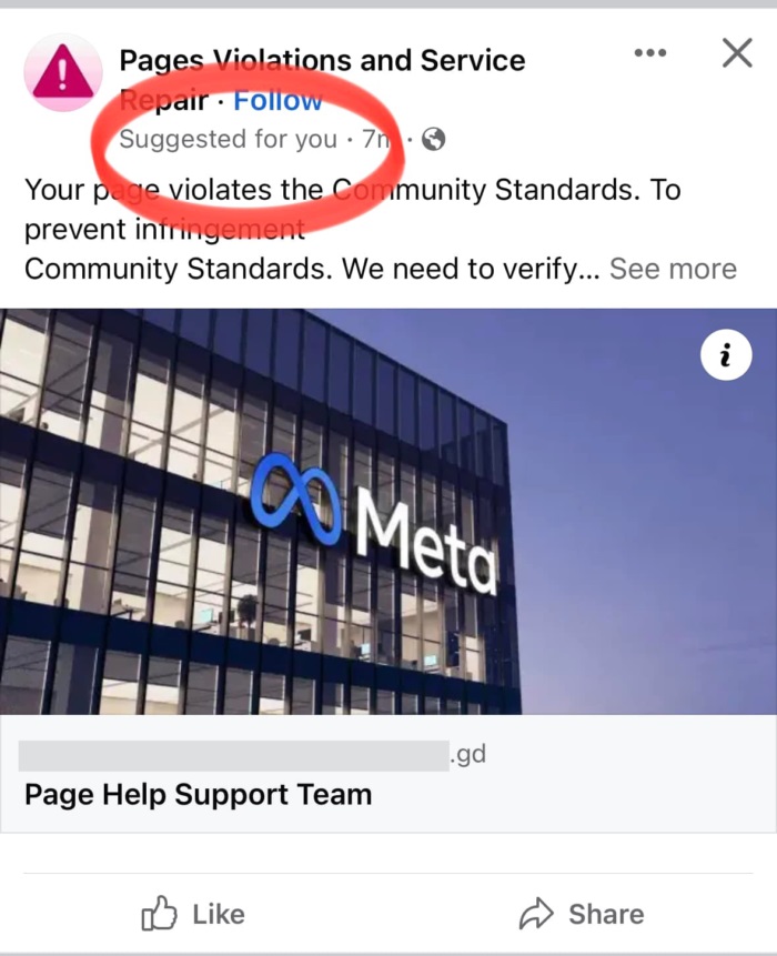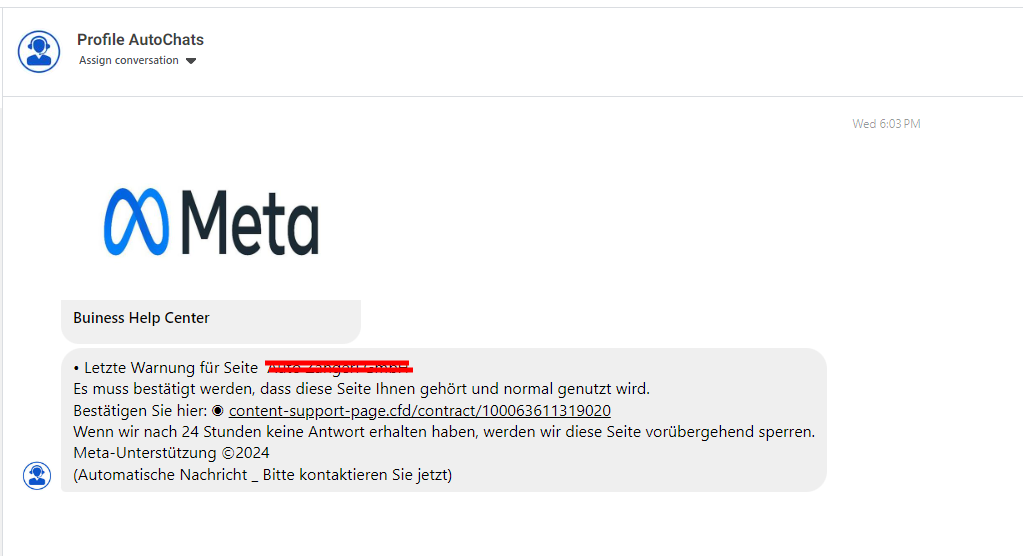 Die Spammer gehen aktuell vermehrt wie folgt vor - eine Seite mit dem Namen "Support Page" schickt über den Facebook Messenger eine Nachricht direkt an eure Unternehmensseite. In dieser Nachricht wird eine "Bestätigung" gefordert, damit eure Seite nicht "von Meta gesperrt wird". Dazu werdet ihr in der Regel aufgefordert, einen in der Nachricht mitgeschickten Link zu klicken.
