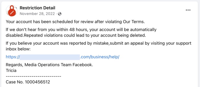 Denn ja - man kann auch Fehler machen, für die Meta einen sperrt. Zum Beispiel eine Copyright Verletzung, falsche Anzeigenkategorie bei Stelleninseraten oder auch Leasing-Angeboten die man bewirbt. Aus diesem Grund sollte man nicht jede Nachricht kategorisch ignorieren - denn das kann nach hinten losgehen!
