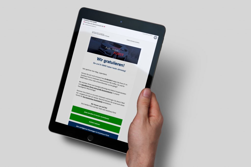 Unser Kunde Autohaus Fürst hat hier alles richtig gemacht. Durch die direkte Ansprache wird der Leser dazu angeleitet den Newsletter zu öffnen und durch die kostenlose Autowaschaktion konnte zum einen die Klickrate (= das Verhältnis von geöffneten Newslettern zu getätigten Klicks auf klickbare Elemente) gesteigert werden und zum anderen haben sie es geschafft, bestehende Kunden erneut zu sich ins Autohaus zu holen.