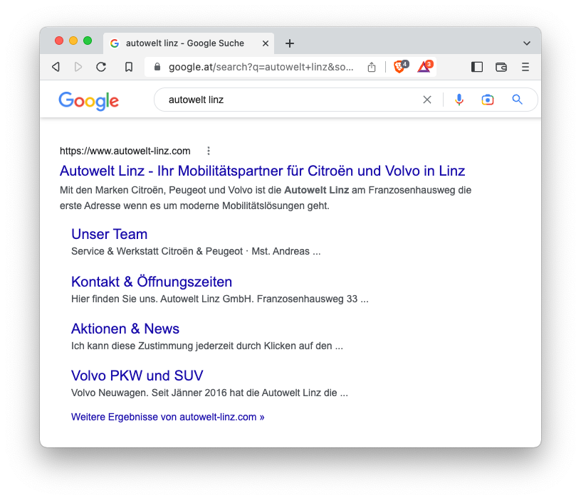 Ein gut gesetzter Meta Title kann mit minimalem Aufwand viel Wirkung erzielen. Der Seitentitel sollte sich von den Meta Titles des Wettbewerbs abheben. So kann auch eine in den Suchergebnissen schlechter gelistete Website noch respektable Klickraten erzielen. Im Screenshot ist ein Suchergebnis der Autowelt Linz zu sehen. Der Meta Title Tag leitet sich von den wichtigsten Positionierung Faktoren des Autohauses ab: Location “Franzosenhausweg”, Herstellermarken, Mobilitätslösungen.